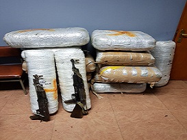 Στο σημείο, βρέθηκαν και κατασχέθηκαν (6) ταξιδιωτικοί σάκοι που περιείχαν (13) δέματα με ακατέργαστη κάνναβη, συνολικού βάρους (166) κιλών και (200) γραμμαρίων καθώς και δύο πολεμικά τυφέκια Kalashnikov .