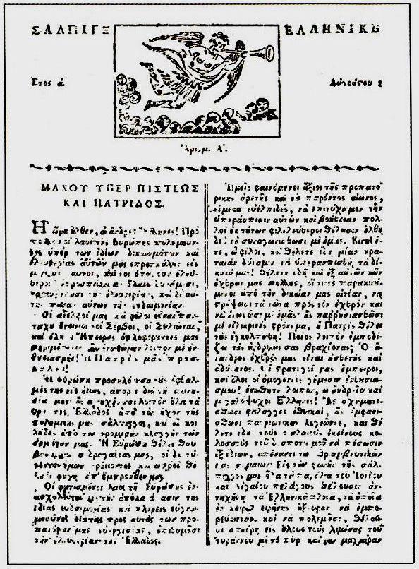 Η πρώτη έντυπη εφημερίδα στην Ελλάδα, που εκδόθηκε την 1η Αυγούστου 1821 στην επαναστατημένη Καλαμάτα.