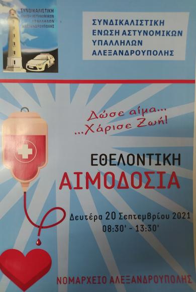 Σάββατο, 18 Σεπτεμβρίου, 2021Εθελοντική αιμοδοσία των αστυνομικών της Αλεξανδρούπολης