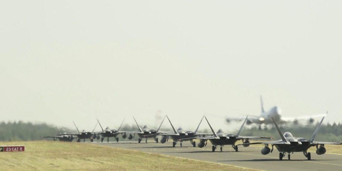 F-22 μαχητικά, πλήρως οπλισμένα, εκτελούν ένα “Elephant Walk”