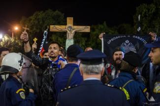 Με σταυρούς στα χέρια και μαύρες σημαίες οι διαδηλωτές που δηλώνουν μέλη εθνικιστικών και παραθρησκευτικών οργανώσεων, συγκεντρώθηκαν για τρίτη φορά έξω από κτίριο για να διαμαρτυρηθούν για τη βλάσφημη, όπως τη χαρακτηρίζουν, παράσταση «Η Ώρα του Διαβόλου» που είναι βασισμένη στο ομώνυμο κείμενο του Φερνάρντο Πεσσόα.