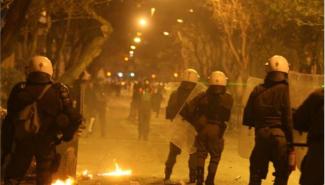Οι δυνάμεις των ΜΑΤ συγκεντρώνονται στην περιοχή, ενώ σε επιφυλακή βρίσκονται και οι «αύρες» της αστυνομίας. Οι άνδρες της αστυνομίας απαντούν στη ρίψη μολότοφ από τους αντιεξουσιαστές με χειροβομβίδες κρότου-λάμψης.