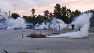 Λίγο πριν τις 9 το βράδυ και ενώ ο ήλιος είχε δύσει, ομάδα διαδηλωτών πλησίασε στα αριστερά της πύλης του εργοστασίου, για να στήσει πανό, μερικές δεκάδες μέτρα πριν τους αστυνομικούς.