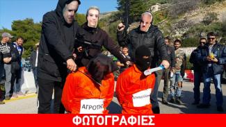 «Εμπνευσμένοι» από τις αποτρόπαιες εκτελέσεις των τζιχαντιστών του Ισλαμικού Χαλιφάτου, οι αγρότες... υποδύθηκαν«δήμιους» πολιτικούς (σ.σ.: φορώντας μάσκες των ΑλέξηΤσίπρα, Βαγγέλη Αποστόλου και Γιώργου Κατρούγκαλου) και «αποκεφάλισαν» έναν γεωργό και έναν κτηνοτρόφο.