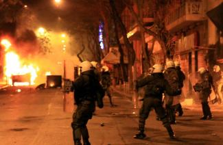 Επίσης οι άγνωστοι έβαλαν φωτιά σε μερικούς κάδους ενώ η αστυνομία κράτησε αμυντική στάση.