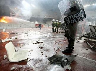 Ο Ολυμπιακός ήταν τυπικά γηπεδούχος στο ντέρμπι με τον Παναθηναϊκό, προηγήθηκε 2-0, οι "πράσινοι" είχαν μείνει με οκτώ παίκτες, μείωσαν με τον Βαζέχα και το 3-1 διαμορφώθηκε από τον Ίβιτς. Οι φίλοι του "τριφυλλιού" όμως, είχαν συμπλοκές με τις αστυνομικές δυνάμεις στο κομμάτι που φιλοξενούνταν. Άναψαν φωτιές στις εξέδρες, έσπασαν καρέκλες και τις πετούσαν στα ΜΑΤ, έπεσε ξύλο και γενικά υπήρξαν άγρια σκηνικά για αρκετή ώρα.