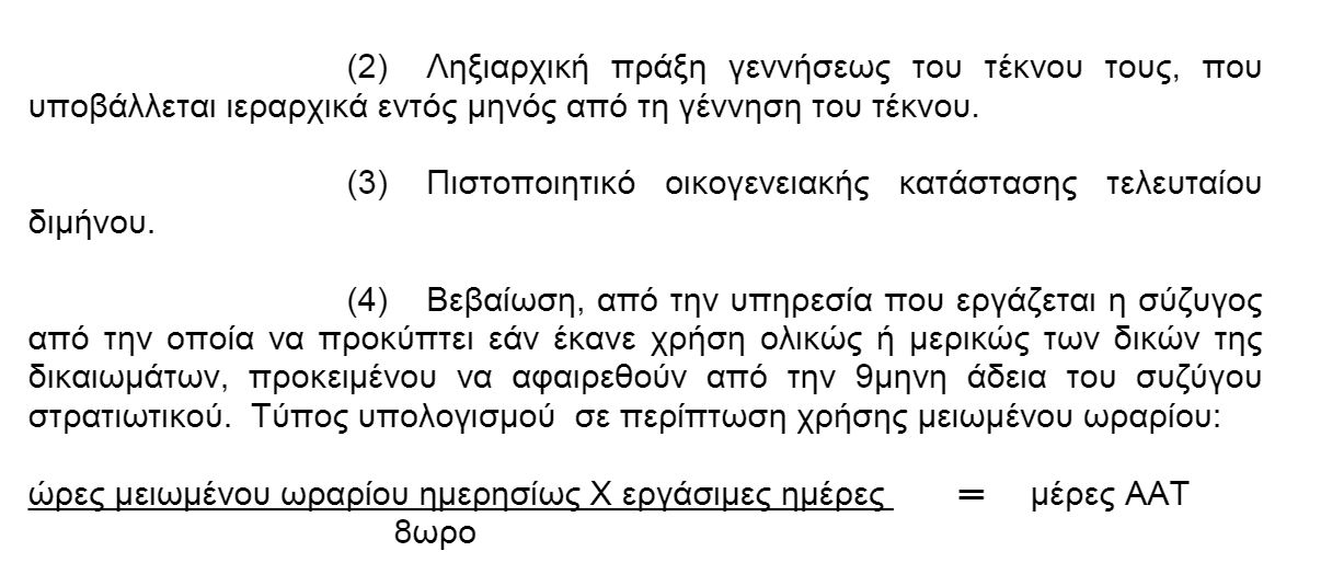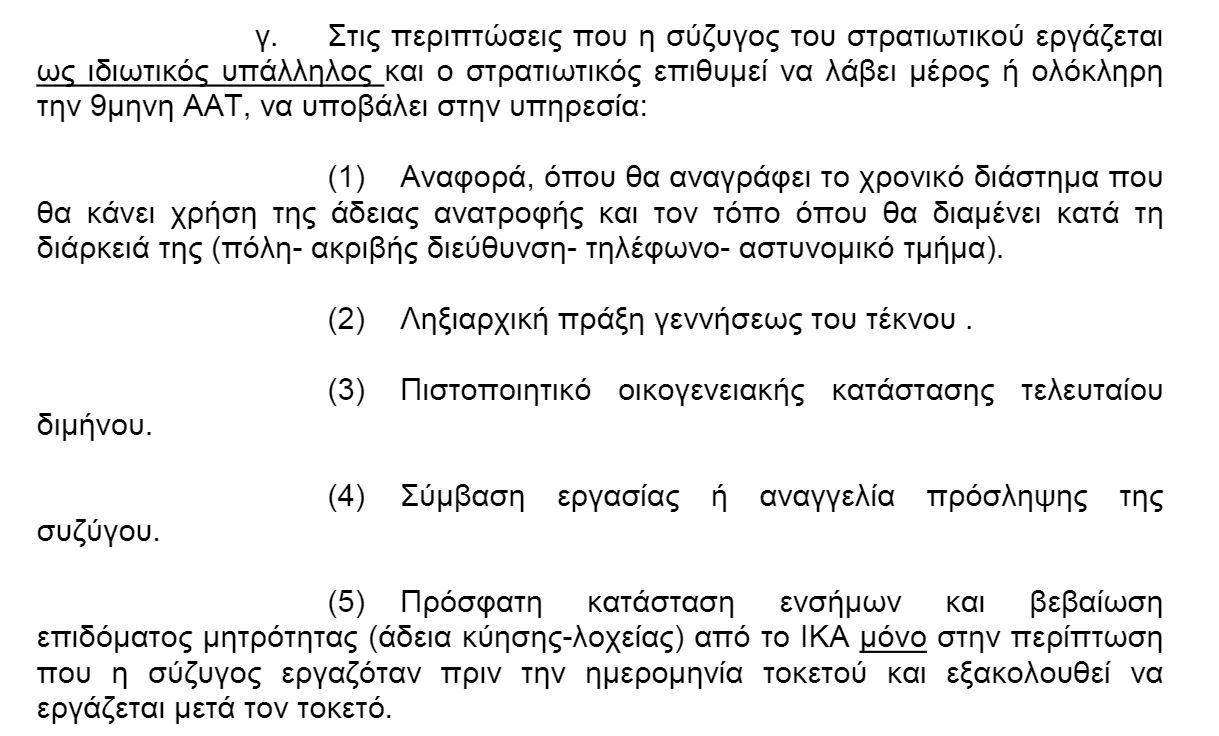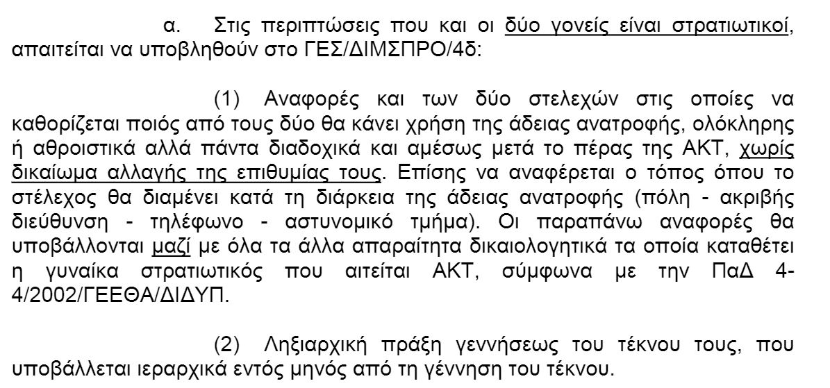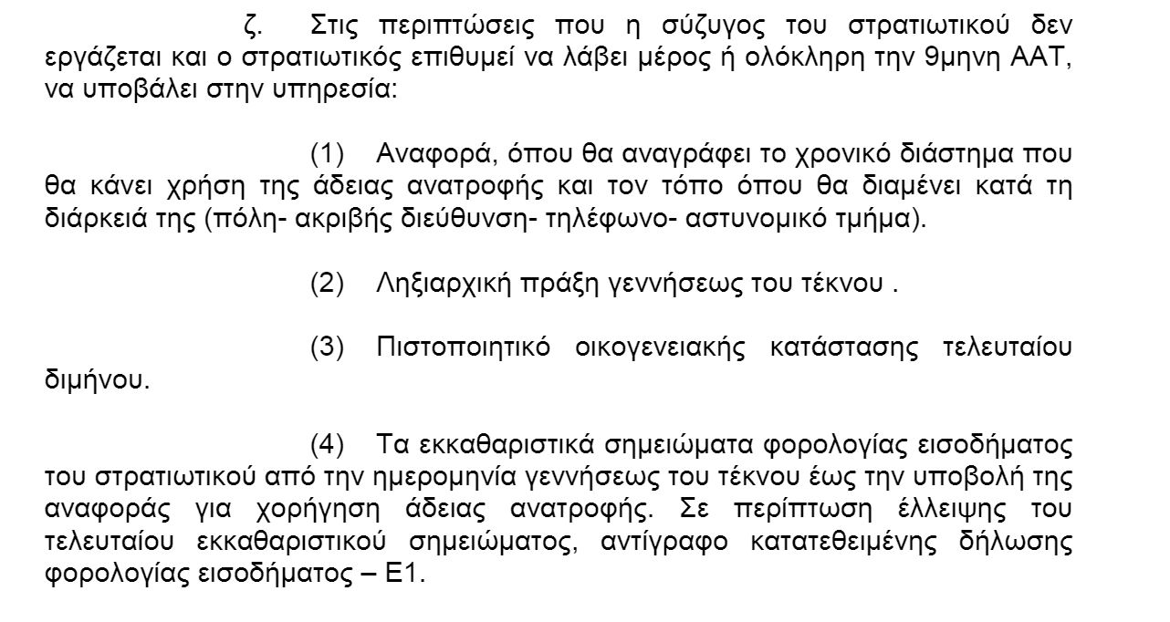 Τα δικαιλογητικά που προβλέπει η διαταγή μόνιμης ισχύος του ΓΕΣ και πρέπει να καταθέσουν όσοι επιθυμούν να λάβουν άδεια ανατροφής τέκνου, είναι ανά περίπτωση τα ακόλουθα: