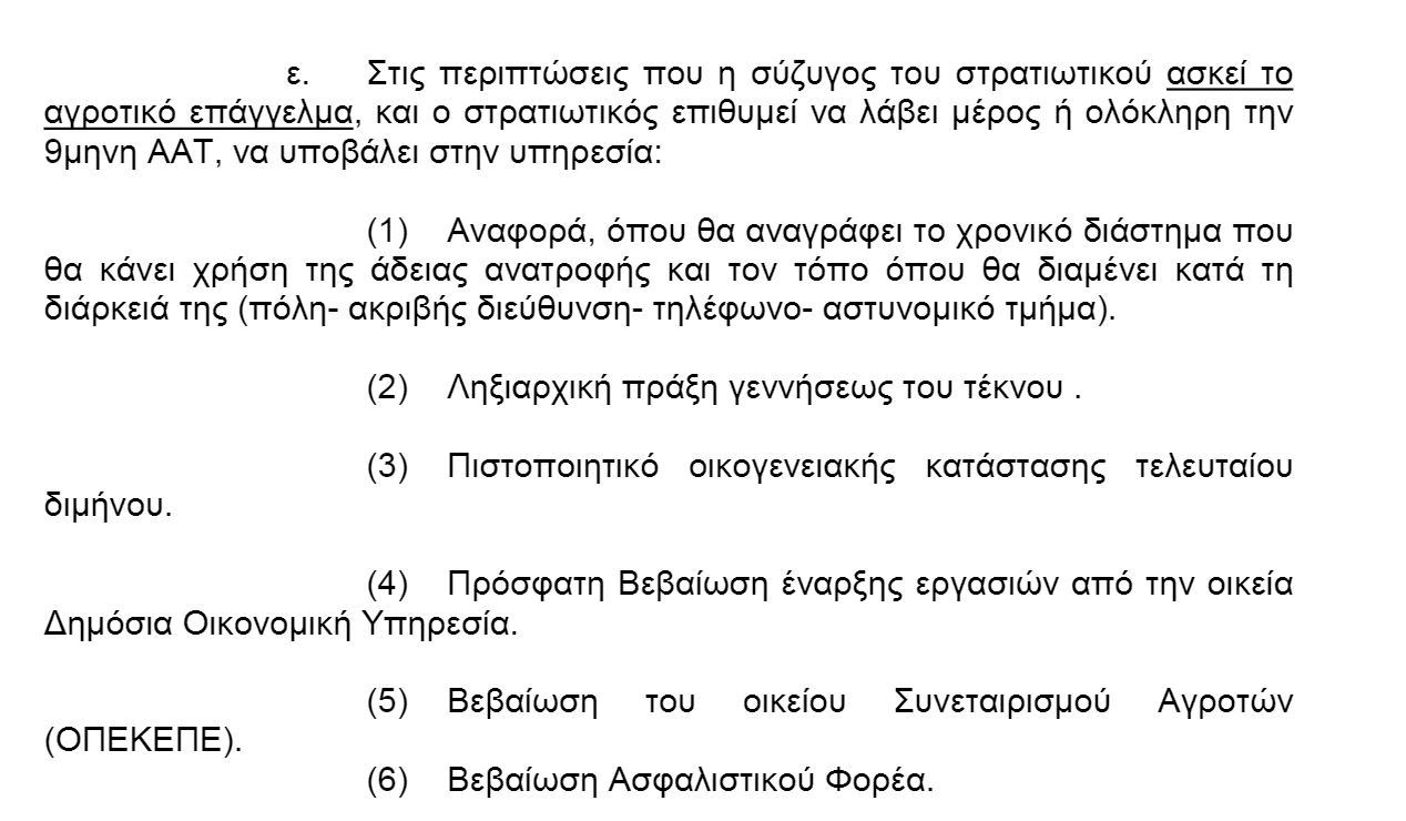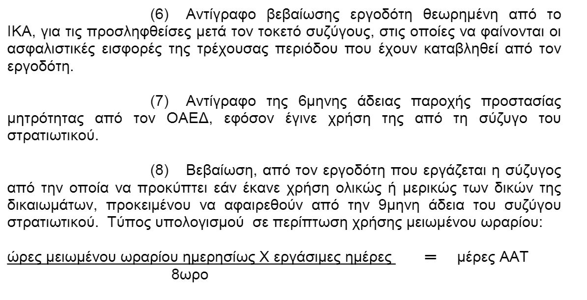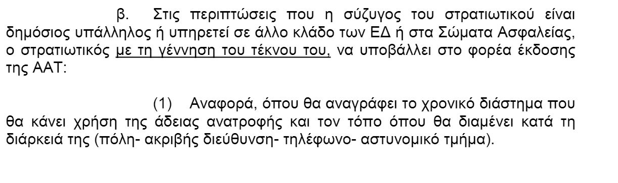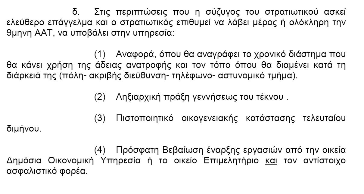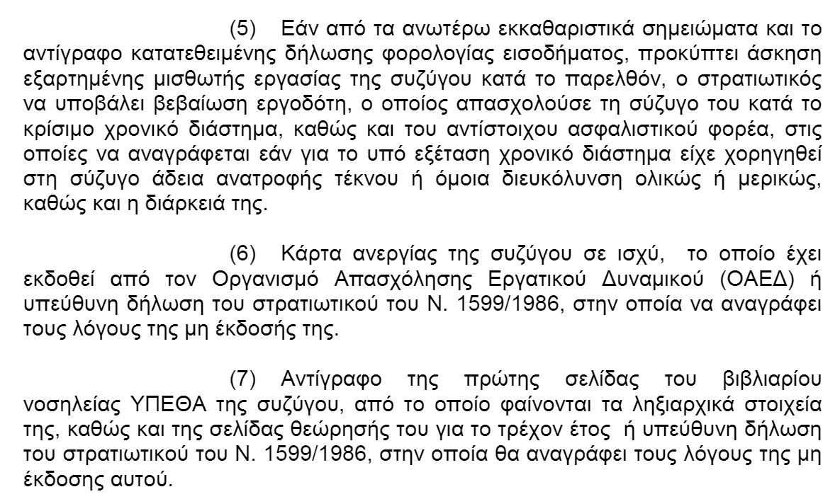 Τα δικαιλογητικά που προβλέπει η διαταγή μόνιμης ισχύος του ΓΕΣ και πρέπει να καταθέσουν όσοι επιθυμούν να λάβουν άδεια ανατροφής τέκνου, είναι ανά περίπτωση τα ακόλουθα: