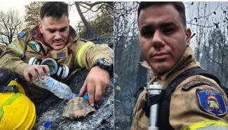 Viral και στην Ευρώπη έγινε η φωτογραφία του Έλληνα πυροσβέστη που δίνει νερό σε μια χελώνα μέσα σε ένα τοπίο καμένα από το καταστροφικό πέρασμα της πυρκαγιάς.