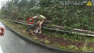Του ζήτησαν να σταματήσει αλλά εκείνος άρχισε να τρέχει στην άκρη του δρόμου. Η κάμερα που είναι προσαρμοσμένη στη στολή του ενός αστυνομικού καταγράφει την καταδίωξη. Δίπλα του ένας άλλος αστυνομικός μαζί με τον αστυνομικό του σκύλο. Ένα μεγάλο λυκόσκυλο με το όνομα «Τζεντάϊ».