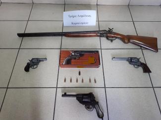 Ειδικότερα οι αστυνομικοί, μετά από κατάλληλη αξιοποίηση στοιχείων, πραγματοποίησαν διαδοχικές νομότυπες έρευνες στις οικίες των συλληφθέντων, όπου βρέθηκαν και κατασχέθηκαν κυνηγετικό όπλο, (3) περίστροφα, τα δύο εκ των οποίων τύπου replica και (7) φυσίγγια διαφόρων τύπων και διαμετρημάτων.