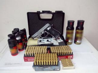 Όπως διαπιστώθηκε από τον αστυνομικό έλεγχο που πραγματοποιήθηκε σε όχημα που οδηγούσε, βρέθηκαν και κατασχέθηκαν ένα πιστόλι κρότου - αερίου με γεμιστήρα και μία χοάνη εκτόξευσης φωτοβολίδων, 9 σπρέι εκτόξευσης χημικών ουσιών και 160 αβολίδωτα φυσίγγια κρότου – αερίου.