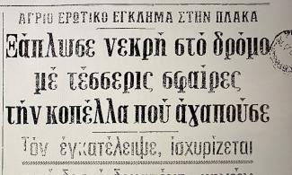 Στη διασταύρωση των οδών Αγίας Φιλοθέης και Απόλλωνος ένας 24χρονος ναυτικός από τα Χανιά δολοφόνησε την 19χρονη Ελένη, πυροβολώντας τέσσερις φορές με περίστροφο «Σμιθ 32». Ο ίδιος ισχυρίστηκε αργότερα στο Αστυνομικό Τμήμα ότι έπειτα από σχέση 15 μηνών, την ζήτησε σε γάμο και εκείνη τον εγκατέλειψε χωρίς κανένα λόγο.