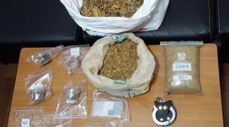 Επιπλέον, ο σκύλος ανιχνευτής που ερεύνησε το σπίτι, ανακάλυψε τρεις συσκευασίες με λαθραίο καπνό βάρους δυο κιλών και 270 γραμμαρίων, ακατέργαστη κάνναβη βάρους 2,6 γραμμαρίων, μία συσκευασία με άγνωστη ουσία βάρους 2,3 γραμμαρίων που εστάλη για ανάλυση, ακατέργαστη κάνναβη αναμεμειγμένη με κλώνους και σπόρους βάρους 4,5 γραμμαρίων, τρία πλαστικά κουτιά με σπόρους κάνναβης, μία ηλεκτρονική ζυγαριά και ένα μεταλλικό τρίφτη.