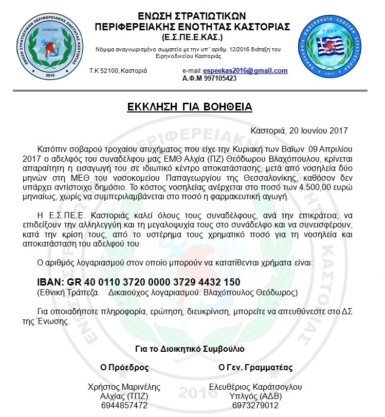 Η Ένωση Στρατιωτικών Περιφερειακής Ενότητας Καστοριάς (Ε.Σ.ΠΕ.Ε) κάνει έκκληση σε όλους του συναδέλφους στρατιωτικούς, ανά την επικράτεια, να συνδράμουν στην μέγιστη προσπάθεια που καταβάλλει ο αδερφός συναδέλφου ΕΜΘ Αλχια (ΠΖ) για να αποκατασταθεί η υγεία του έπειτα από τον σοβαρό τραυματισμό του που προκλήθηκε από τροχαίο ατύχημα.