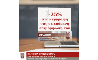 Ανταποδίδοντας την εμπιστοσύνη σας δια της επιλογής των συνεργατικών εκπαιδευτικών προγραμμάτων του ΚΕΔΙΒΙΜ του Παντείου Πανεπιστημίου, παρέχουμε 25% έκπτωση σε οποιοδήποτε επόμενο συνεργατικό πρόγραμμα της επιλογής σας.