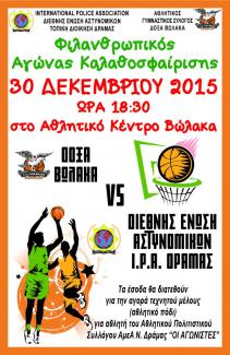 ΕΝΑΣ ΑΓΩΝΑΣ ΜΠΑΣΚΕΤ ΔΙΑΦΟΡΕΤΙΚΟΣ ΑΠΟ ΤΟΥΣ ΑΛΛΟΥΣ ΘΑ ΠΡΑΓΜΑΤΟΠΟΙΗΘΕΙ ΤΙΣ ΑΓΙΕΣ ΗΜΕΡΕΣ ΤΩΝ ΧΡΙΣΤΟΥΓΕΝΝΩΝ, ΜΕ ΤΗ ΣΥΜΜΕΤΟΧΗ ΑΘΛΗΤΩΝ ΑΣΤΥΝΟΜΙΚΩΝ, ΜΕΛΩΝ ΤΗΣ ΤΟΠΙΚΗΣ ΔΙΟΙΚΗΣΗΣ ΔΡΑΜΑΣ (I.P.A.) ΤΗΣ ΔΙΕΘΝΟΥΣ ΕΝΩΣΗΣ ΑΣΤΥΝΟΜΙΚΩΝ, ΤΗΝ ΤΕΤΑΡΤΗ 30 ΔΕΚΕΜΒΡΙΟΥ 2015 ΚΑΙ ΩΡΑ 18:00΄ , ΣΤΟ ΚΛΕΙΣΤΟ ΑΘΛΗΤΙΚΟ ΚΕΝΤΡΟ ΒΩΛΑΚΑ.