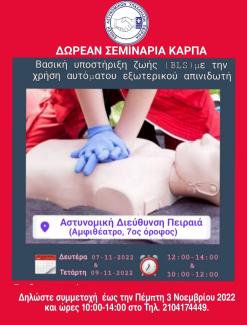 Η Ένωση Αστυνομικών Υπαλλήλων Πειραιά διοργανώνει ΔΩΡΕΑΝ για τα μέλη μας, δύο εκπαιδευτικά σεμινάρια Καρδιοπνευμονικής Αναζωογόνησης (ΚΑΡΠΑ) και χρήσης αυτόματου εξωτερικού απινιδωτή, σε συνεργασία με την COSMOCLINIC, τον Ιατρικό Σύλλογο Πειραιά και τον Δήμο, για την προαγωγή της Δημόσιας Υγείας.
