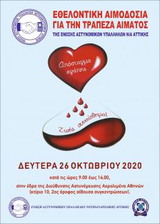 Η Ένωσή μας καλεί τα μέλη της να λάβουν μέρος στην αιμοδοσία που διοργανώνει τη Δευτέρα 26/10/2020 κατά τις ώρες 09:00΄ έως 14:00΄, στην έδρα της Διεύθυνσης Αστυνόμευσης Αερολιμένα Αθηνών (κτίριο 10, 2ος όροφος αίθουσα συγκεντρώσεων Δ.Α.Α.Α).