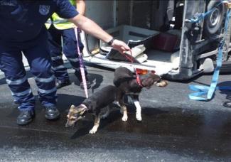 Αστυνομικοί παραλαμβάνουν δύο σκυλάκια από αυτοκίνητο που ανατράπηκε στον αυτοκινητόδρομο στη Γερμασόγεια.