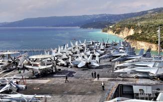Τριγύρω μας μέλη του πληρώματος ασχολούνταν ελέγχοντας και συντηρώντας τα αεροσκάφη ηλεκτρονικού πολέμου EA-18G Growler, τα μαχητικά F/A-18 Hornet και F/A- 18 Super Hornets, τα ιπτάμενα ραντάρ Northrop Grumman E-2 Hawkeyes και τα ελικόπτερα έρευνας και διάσωσης και ανθυποβρυχιακού πολέμου Sikorsky SH-60/MH-60 Seahawk.
