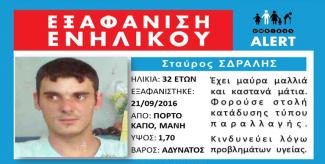 Ο Σταύρος Σδράλης, 32 ετών, εξαφανίστηκε στις 21/09/16 στη θαλάσσια περιοχή Πόρτο Κάγιο του Δήμου Ανατολικής Μάνης, όπου είχε μεταβεί για τη διενέργεια υποβρύχιας αλιείας.