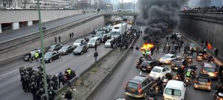 Εκατοντάδες ταξιτζήδες κατέλαβαν κομβικά σημεία στο οδικό δίκτυο του Παρισιού, στήνοντας οδοφράγματα και βάζοντας φωτιά σε λάστιχα αυτοκινήτων, προτού οι αστυνομικές δυνάμεις χρησιμοποιήσουν δακρυγόνα για να τους διαλύσουν.