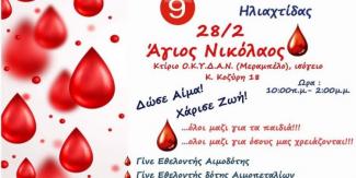 Ο σύλλογος "Ηλιαχτίδα" σε συνεργασία με την Ένωση μας και το Τμήμα Οδηγισμού Τοπικού Τμήματος Αγίου Νικολάου διοργανώνει την 9η αιμοδοσία για τα παιδιά με νεοπλασία του ΠΑΓΝΗ. Είναι μια σειρά δράσεων που θα πραγματοποιηθεί την Κυριακή 28/02/2021, στο ισόγειο του κτιρίου Ο.Κ.Υ.Δ.Α.Ν. (Μεραμπέλο) που βρίσκεται στην οδό Κ. Κοζύρη αρ. 18.