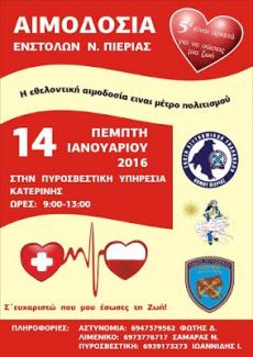 Οι Υπάλληλοι των Σωμάτων Ασφαλείας του Νομού Πιερίας, Αστυνομικοί, Λιμενικοί και Πυροσβέστες διοργανώνουμε από κοινού εθελοντική αιμοδοσία την Πέμπτη 14 Ιανουαρίου 2016 στην Πυροσβεστική Υπηρεσία Κατερίνης και από ώρα 09:00 έως και 13:00.
