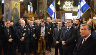 Στην επιμνημόσυνη δέηση στον Ναό των Παμμεγίστων Ταξιαρχών, χοροστάτησαν ο Θεοφιλέστατος Επίσκοπος Ναζιανζού κ.κ. Θεοδώρητος και ο Προϊστάμενος της Θρησκευτικής Υπηρεσίας της Ελληνικής Αστυνομίας, Αρχιμανδρίτης κ. Νεκτάριος ΚΙΟΥΛΟΣ.