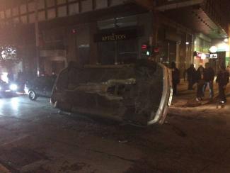 Άγνωστοι αναποδογύρισαν δύο αυτοκίνητα, προκαλώντας υλικές ζημιές, στη Σόλωνος, ενώ έχουν προκληθεί και ζημιές σε τραπεζικά καταστήματα στην περιοχή κατά της διάρκεια της πορείας για τον Νίκο Ρωμανό, η οποία είναι ακόμα σε εξέλιξη.