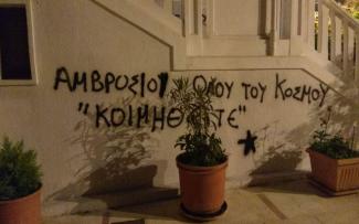 Οι αντιεξουσιαστές έγραψαν συνθήματα κατά της εκκλησίας αλλά και κατά του Αμβρόσιου τον οποίο χαρακτηρίζουν «νεοναζί».