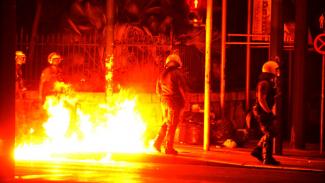 Εν συνεχεία έριξαν βόμβες μολότοφ εναντίον της διμοιρίας των ΜΑΤ που εκτελούσε υπηρεσία στο σημείο, ενώ οι Αστυνομικοί για να τους απωθήσουν χρησιμοποίησαν χειροβομβίδες κρότου λάμψης.