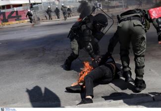 Ο άνδρας λαμπάδιασε καθώς πήρε φωτιά το πόδι του, ωστόσο οι άνδρες των ΜΑΤ έσπευσαν με ψυχραιμία και έσβησαν τη φωτιά με αντιπυρική κουβέρτα και πυροσβεστήρα.