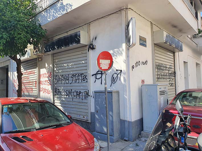 Ομάδα ατόμων που μάχονται την ειρηνική συμβίωση, που ζουν με το όραμα της βίας, πραγματοποίησαν επιδρομή στα γραφεία μας, κατέστρεψαν τις κάμερες ασφαλείας και γεμίσαν τους τοίχους και το ρολά με μπογιές και συνθήματα και έριξαν τρικάκια...