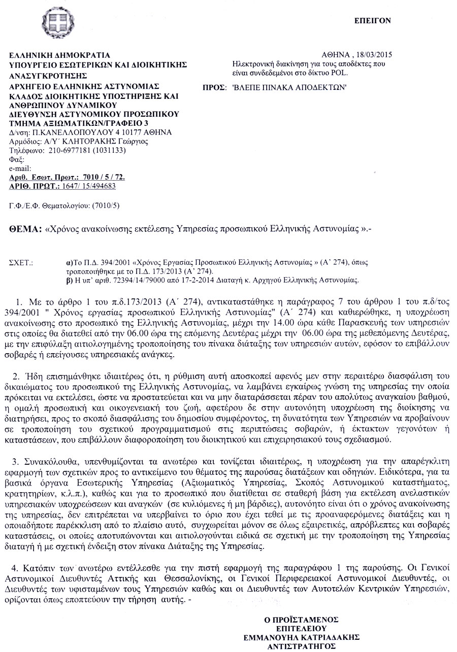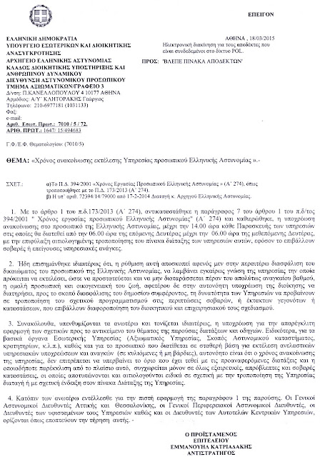Πέρασαν περίπου (8) μήνες από την ημέρα που εκδόθηκε η Διαταγή με αριθ. πρωτ. 1647/15/494683 από 18/3/2015 του Αρχηγείου Ελληνικής Αστυνομίας, η οποία υπενθύμιζε σε όλους τους προϊσταμένους – τμηματάρχες – διοικητές – διευθυντές όλων των Υπηρεσιών της ΕΛ.ΑΣ.,την υποχρέωσή τους για πιστή εφαρμογή της ισχύουσας νομοθεσίας αναφορικά με το ωράριο εργασίας των συναδέλφων, και συγκεκριμένα για την ανακοίνωση της υπηρεσίας η οποία ανέφερε ότι: