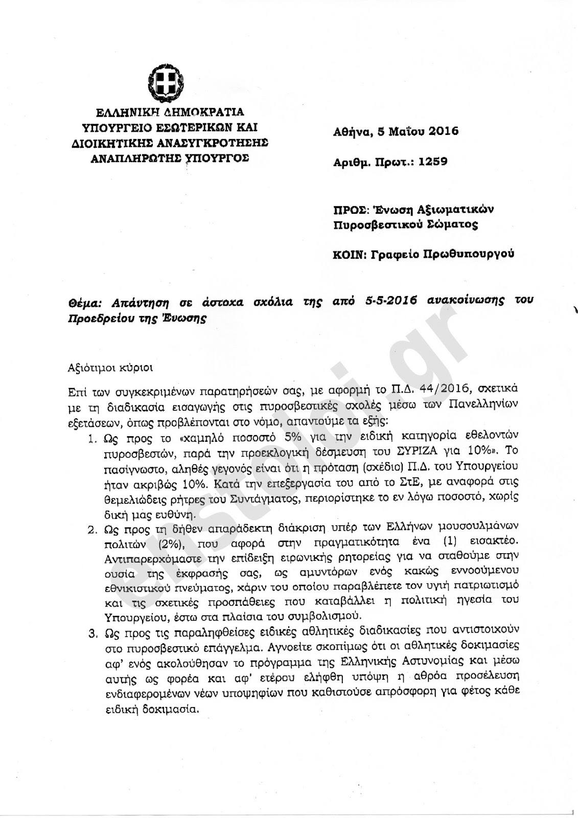 Θυμηθείτε ΕΔΩ το έγγραφό με όλες τις παρατηρήσεις της Ένωσης Αξιωματικών Πυροσβεστικού Σώματος και δείτε το παρακάτω έγγραφο του Υπουργείου Διοικητικής Ανασυγκρότησης με την απάντηση του Αναπληρωτή Υπουργού Ν. Τόσκα.