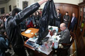 Σε μια πρωτοφανή ενέργεια προχώρησαν σήμερα φοιτητές από το Εθνικό Καποδιστριακό Πανεπιστήμιο Αθηνών (ΕΚΠΑ): εισέβαλλαν στην πρυτανεία και άδειασαν μία σακούλα με σκουπίδια πάνω στο γραφείο του(!) του αντιπρύτανη κ. Αντώνη Καλοκαιρινού.