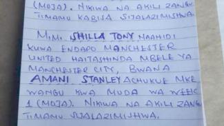«Δια του παρόντος, εγώ ο Αμάνι Στάνλεϊ, υπόσχομαι να δώσω την σύζυγό μου για μια εβδομάδα στον φίλο μου, τον Τόνι Σίλα αν η Μάντσεστερ Σίτι δεν κατακτήσει την Premier League στο ματς με την Μάντσεστερ Γιουνάιτεντ. Είμαι απολύτως καλά και δεν αναγκάστηκα από κανέναν σε αυτή τη συμφωνία», αναφέρει το συμφωνητικό σύμφωνα με την NairobiNews.