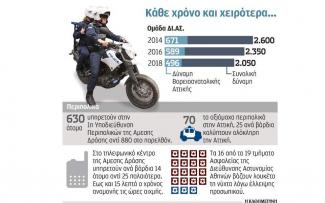 Σύμφωνα με στοιχεία που περιήλθαν στη διάθεση της «Κ», λόγω υποστελέχωσης της ομάδας, στην περιοχή που περικλείεται από τα τμήματα Καισαριανής, Παγκρατίου, Βύρωνα και Υμηττού δεν έχει προβλεφθεί περιπολία δικυκλιστών. Στην Κηφισιά, όπου τα ξημερώματα της Δευτέρας ληστές πυροβόλησαν και τραυμάτισαν σοβαρά τον 52χρονο επιχειρηματία και συνολικά στη Διεύθυνση Αστυνομίας Βορειοανατολικής Αττικής, η ΔΙ.ΑΣ. διαθέτει στη δύναμή της 496 αστυνομικούς 26% λιγότερους σε σύγκριση με το 2014.
