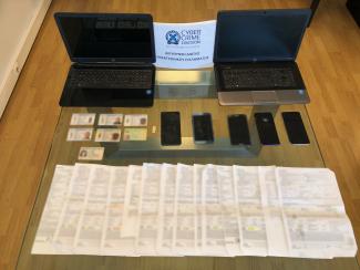 Σε έρευνα που πραγματοποιήθηκε χθες, Τετάρτη 20 Απριλίου 2021, συνολικά βρέθηκαν και κατασχέθηκαν 2 φορητοί υπολογιστές, 5 συσκευές κινητών τηλεφώνων, μονάδα ψηφιακής αποθήκευσης, 7 δελτία ταυτότητας αλλοδαπών καθώς και πλήθος εγγράφων και παραστατικών που σχετίζονται με την υπόθεση.
