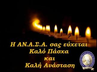 Τα μέλη της ΑΝ.Α.Σ.Α. ευχόμαστε από καρδιάς σε όλους τους συναδέλφους μας, Καλό Πάσχα και Καλή Ανάσταση και υπενθυμίζουμε στους συναδέλφους που εργάζονται ότι ως επίσημες αργίες λογίζονται η Μ. Παρασκευή (10/04), η Κυριακή του Πάσχα (12/04) και η Δευτέρα του Πάσχα (13/04).