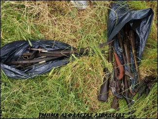 - (5) μακρύκαννα τυφέκια, (2) πιστόλες (κουμπούρες), (4) περίστροφα και πιστόλι, όλα παλαιού τύπου, πιθανόν ιστορικής – συλλεκτικής σημασίας,