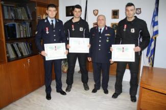 Με το μετάλλιο του Αστυνομικού Σταυρού, που απονέμεται για εξαίρετες πράξεις ανδραγαθίας, τιμήθηκαν την Τετάρτη (24/12) τρεις αστυνομικοί από τον Γενικό Αστυνομικό Διευθυντή Θεσσαλονίκης, υποστράτηγο Βάιο Χονδρό.