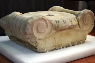 Πρόκειται για μαρμάρινο ιωνικό κιονόκρανο, σχεδόν ακέραιο, ο εχίνος του οποίου φέρει διακόσμηση ιωνικού κυματίου και τα προσκεφάλαια φέρουν διακόσμηση με ζωστήρες ενώ οι οφθαλμοί των ελίκων είναι επίπεδοι και στην άνω επιφάνεια φέρει, ακανόνιστες λαξεύσεις, τα εγχάρακτα γράμματα «ΙΓ», πιθανόν τεκτονικά σύμβολα καθώς και εγχάρακτο κεφάλι ανθρώπινης μορφής σε πλάγια όψη. Έχει μέγιστο σωζόμενο μήκος στις έλικες, εβδομήντα ένα (71) εκατοστά, άβακα πενήντα ένα επί σαράντα πέντε (51χ45) εκατοστά, κάτω επιφάνεια πλάτους σαράντα τέσσερα και μισό (44,5) εκατοστά και μέγιστο ύψος στις έλικες είκοσι εννέα (29) εκατοστά.
