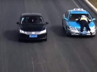Το περιστατικό συνέβη στην Κίνα όταν δύο αστυνομικοί σταμάτησαν οδηγό ταξί για έναν τυπικό έλεγχο όμως αυτός πάτησε γκάζι με αποτέλεσμα να καταλήξει πάνω στο καπό του αυτοκινήτου.