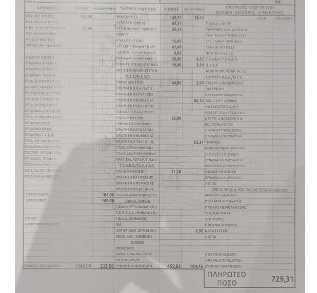Χαρακτηριστική είναι η περίπτωση αστυνομικού, ο οποίος επικοινώνησε με το Policenet.gr και επισήμανε πως αυτό τον μήνα, παρά το γεγονός ότι εργάστηκε σχεδόν το μέγιστο δυνατό των υπερωριών που μπορούσε (4 πενθήμερα και 54 ώρες νυχτερινά), τελικά οι μηνιαίες του αποδοχές είναι μόλις ... 729,31 ευρώ.