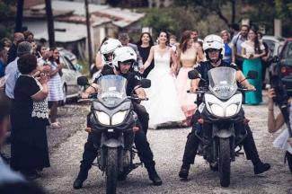 Το μυστήριο τελέστηκε στην εκκλησία του Αγίου Αθανασίου στο Ζάππειο Λάρισας, ενώ τη νύφη συνόδευσαν στην εκκλησία με τις μηχανές τους συνάδελφοι του γαμπρού δίνοντας ένα άλλο χρώμα στη γαμήλια τελετή.