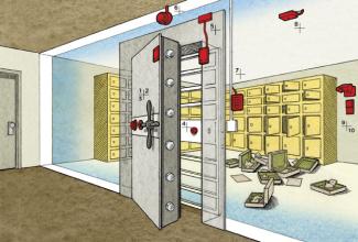 Το πρώτο εμπόδιο ήταν η ατσαλένια πόρτα ασφαλείας, που οδηγούσε στην κεντρική αποθήκη. Ζύγιζε τρεις τόνους και δεν θα τρυπούσε, ούτε αν την χτυπούσαν με ηλεκτρικό τρυπάνι για 12 συνεχόμενες ώρες. Σε περίπτωση βέβαια που προσπαθούσαν, ακόμα και ένα χτύπημα αρκούσε για να ενεργοποιήσει τον συναγερμό σεισμού. Για να ανοίξει η πόρτα χωρίς βία, χρειαζόταν ένα τετραψήφιο αριθμό και ένα κλειδί, που ήταν σχεδιασμένο έτσι ώστε να είναι σχεδόν αδύνατο να αντιγραφεί. Ένας δεύτερος κωδικός ήταν απαραίτητος για να απενεργοποιηθεί το μαγνητικό πεδίο που προστάτευε την πόρτα. Αν κάποιος κατάφερνε να ξεπεράσει το πρώτο επίπεδο ασφάλειας, θα είχε να αντιμετωπίσει τους ανιχνευτές θερμότητας, κίνησης και φωτός που υπήρχαν μέσα στην αποθήκη.