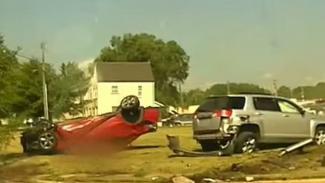 Βίντεο από κάμερα σε όχημα δείχνει τη στιγμή της σφοδρής σύγκρουσης, τα πόδια της γυναίκας να κρέμονται έξω από το αναποδογυρισμένο αμάξι και τους αστυνομικούς να τρέχουν να σηκώσουν το όχημα για να την απεγκλωβίσουν.